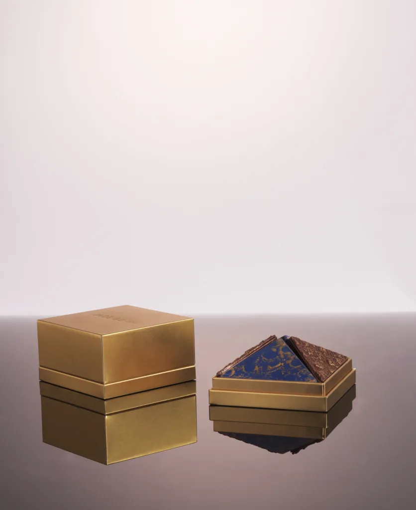 Avec Mirage, Jade Genin signe une création sculpturale inspirée de la pyramide du Louvre. Cette pièce en édition limitée pour la fin d’année, reprend les codes graphiques emblématiques de la chocolatière, notamment ceux des célèbres pyramidions. La structure géométrique aux lignes nettes évoque les jeux de lumière sur le verre du monument parisien. Sous cette architecture minimaliste se cachent des pralinés de saison travaillés avec une précision joaillière : amandes et cannelle de Ceylan, fèves de tonka et noix de pécan, amandes et éclats de macarons relevés d’un trait de rhum, ou encore pistache de Bronte à cœur coulant citron selon les déclinaisons. Entièrement fabriquée à la main, sans additif ni arôme artificiel, la collection Mirage se distingue par des textures généreuses et un cacao d’origine qui s’exprime avec intensité. Certaines teintes sont proposées en exclusivité pour le boulevard Haussmann, en écho aux vitrines de Noël des Galeries Lafayette, où Jade Genin tient un pop-up jusqu’au 12 janvier au 4ème étage.