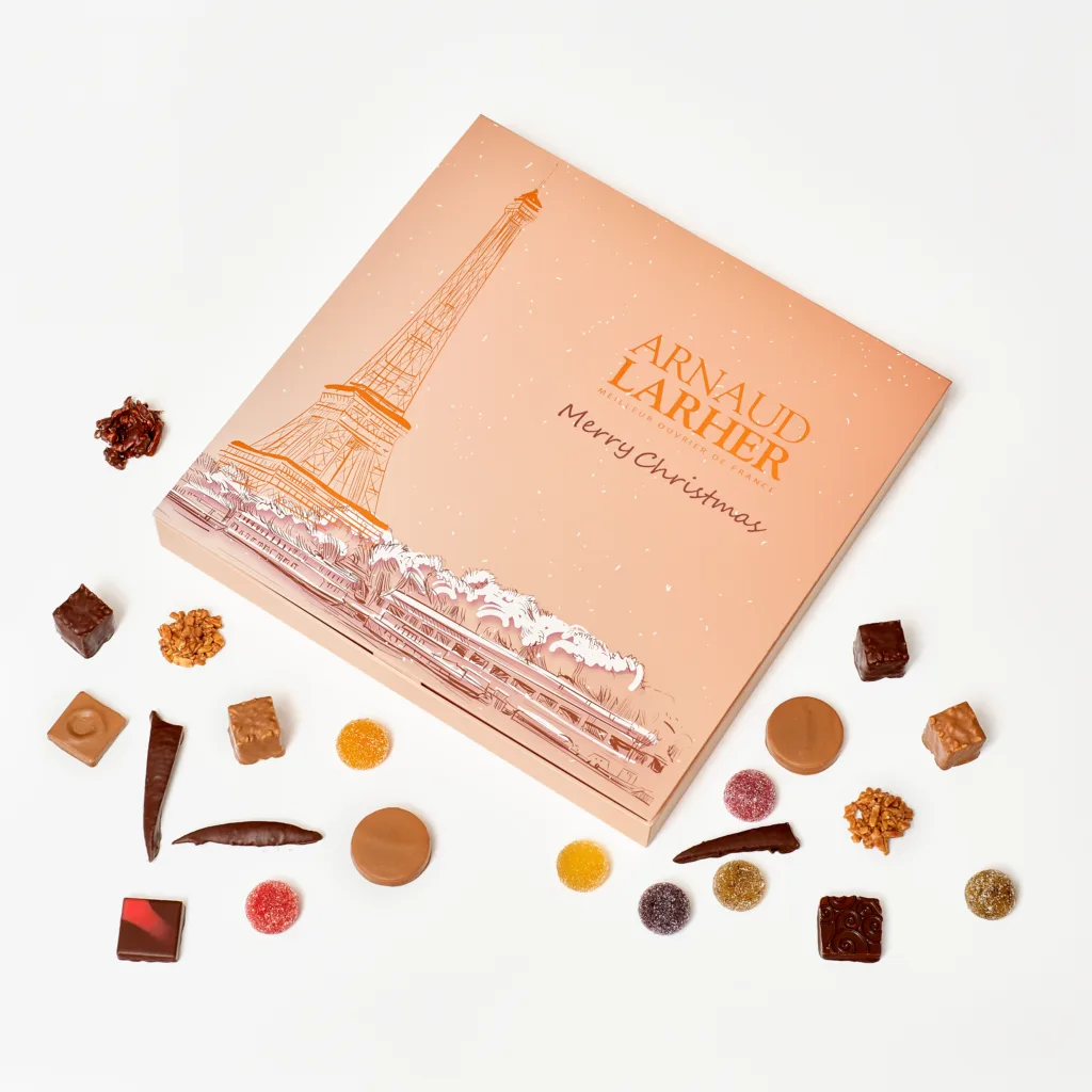 Viewed from above, it’s a simple circle. But once opened, it reveals an entire world. Inspired by the Place de l’Étoile and its twelve avenues, the Triomphe Calendar reimagines the countdown to Christmas with elegance: 24 windows revealing the magic of Paris, with two rotating circles echoing the streets surrounding the Arc de Triomphe. This calendar plays with Parisian geometry and transforms it into a chocolaty ritual. It’s Christmas the Parisian way: slightly theatrical and very refined. And it’s not just 24 but 30 chocolate treats in total, including dark and milk pralines and decadent chocolate squares.