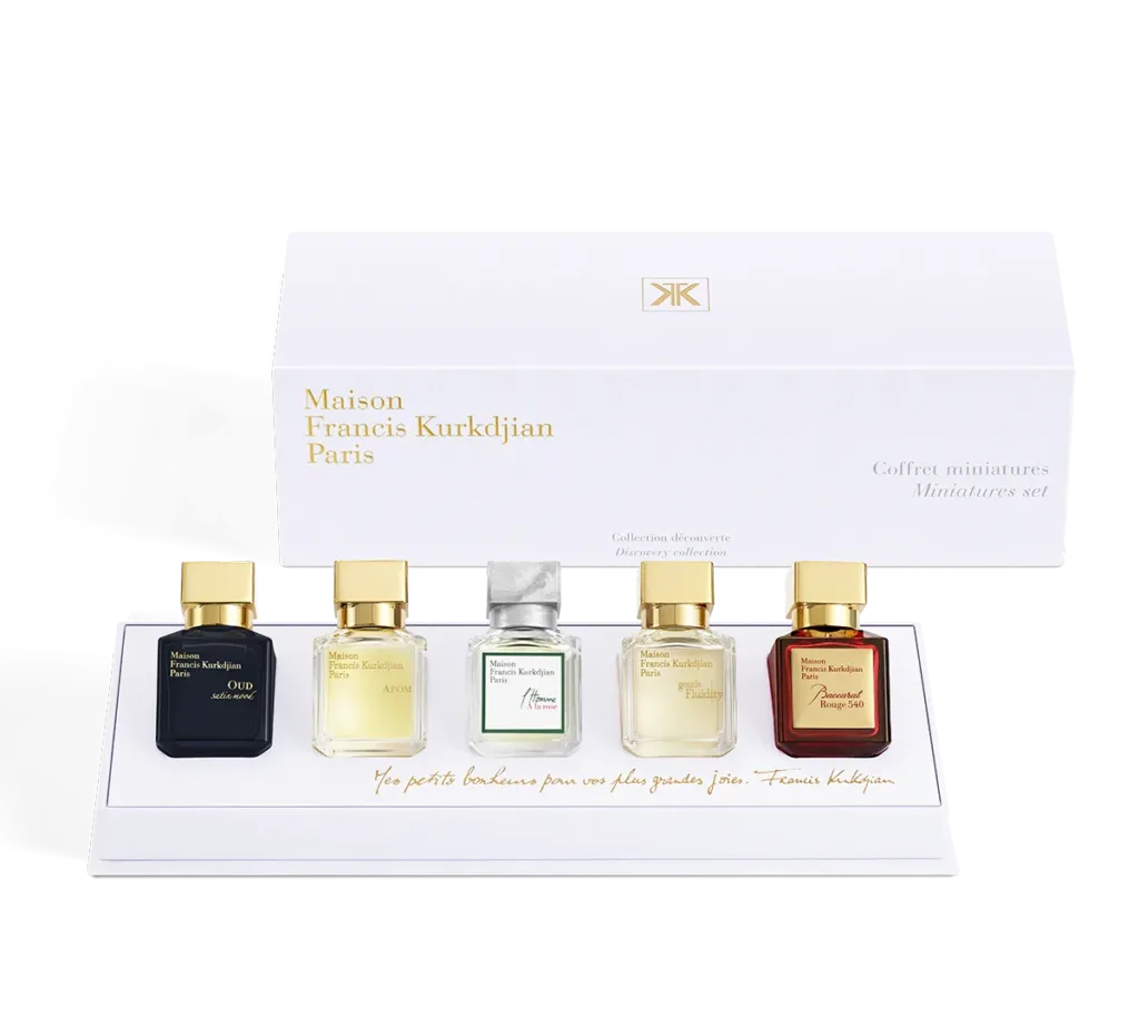 This coffret from Maison Francis Kurkdjian brings together five 10 ml miniatures, travel‑size versions of the House’s iconic 70 ml bottles. It offers a beautifully curated overview of the perfumer’s olfactory universe, spanning precious woods, modern florals and instantly recognisable signatures. OUD satin mood unfurls a sensual blend of oud, rose and vanilla, like a veil of silk. APOM (“A Piece Of Me”) plays the card of an intimate, luminous, second‑skin trail. L’Homme À la rose presents a contemporary take on rose for men, both fresh and structured. gentle Fluidity Gold wraps the skin in an addictive cloud of vanilla, musks and amber notes. Finally, Baccarat Rouge 540 extrait de parfum closes the set with its immediately recognisable trail, the House’s best‑seller. Released as a limited edition, this set is the perfect gift to explore the Francis Kurkdjian universe and find a signature scent.