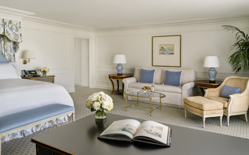 Since it first opened, the hotel has embraced an aesthetic inspired by grand French residences, and this renovation only enhances that spirit. Hexagon‑inspired fabrics, gilt‑framed mirrors, softly metallic wall sconces and porcelain vases create an almost Parisian décor, transplanted under the Californian sun. Certain historic elements have been preserved as nods to the property’s memory: Rose Aurora marble basins sourced in Portugal, artworks by longtime collaborator Hampton Hall, and curtains recreated by the original makers. The result is a very classic kind of luxury, yet one that never feels frozen in time.